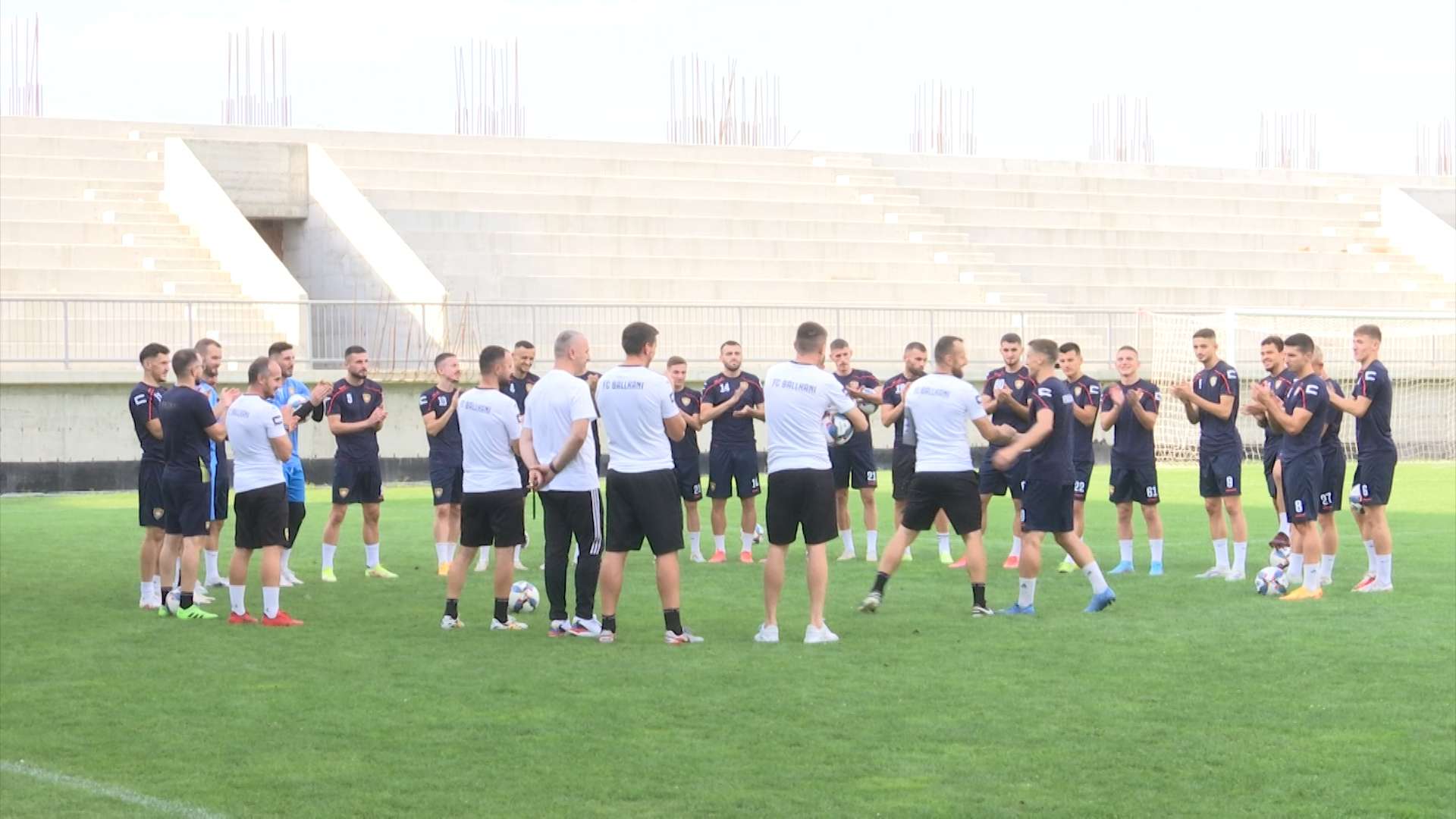 Trajneri Ilir Daja doli i parë në fushë në stërvitjen e së mërkurës të Ballkanit, teksa pas tij Armend Thaqi...