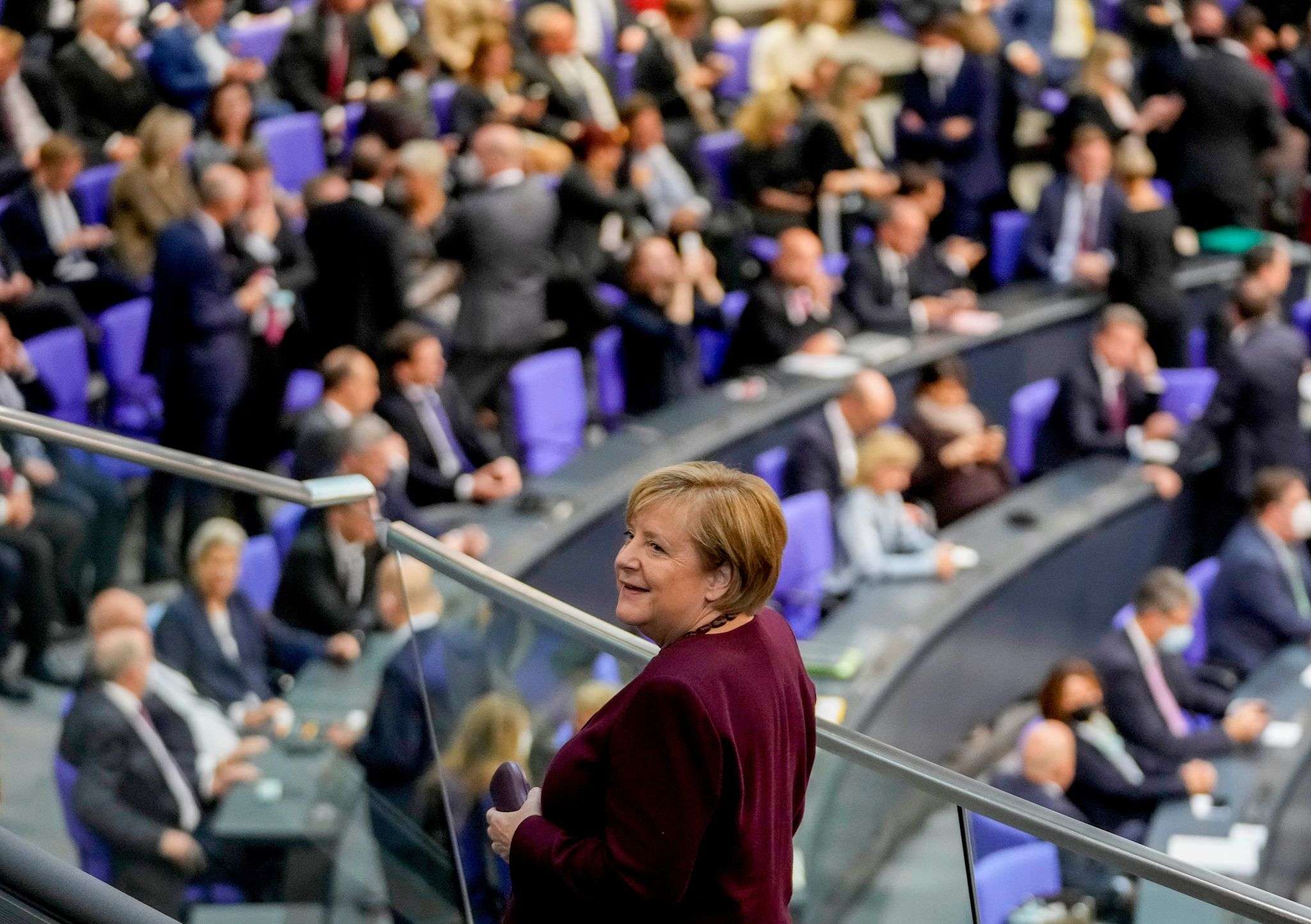 Kancelarja gjermane në largim, Angela Merkel, ka shikuar nga galeria e vizitorëve të martën derisa Parlamenti i ri ka zgjedhur...