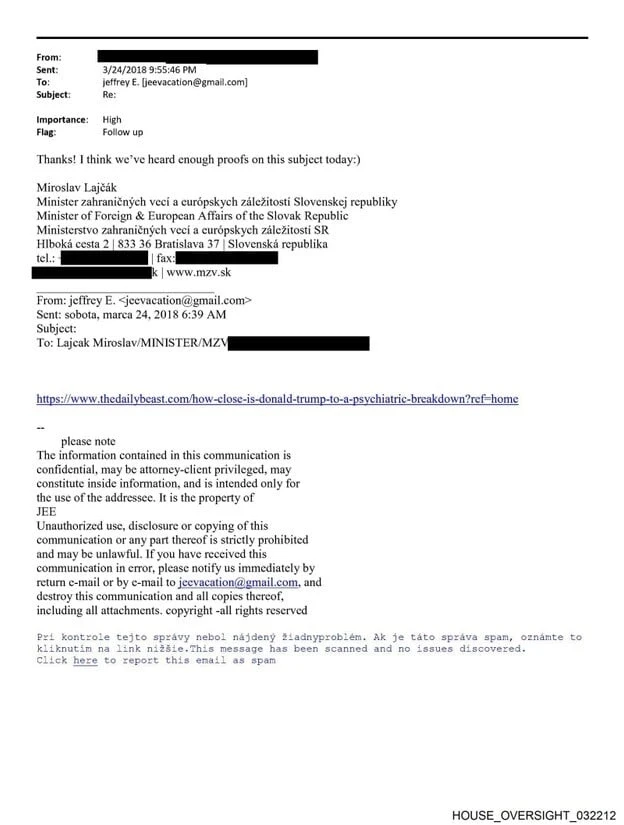 Në një e-mail të vitit 2019, Epstein ia kishte prezantuar një kontakti të paidentifikuar Lajçakun si ministrin aktual të Jashtëm të Sllovakisë, ish-president të Kombeve të Bashkuara dhe “mbi të gjitha si mik”.