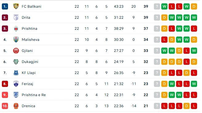 Letër lexuesit — pse po kërkojmë mbështetjen tuaj KontribuoBallkani e Drita kanë nga 39 pikë, kurse Prishtina mbetet në vendin e tretë me 37 pikë.