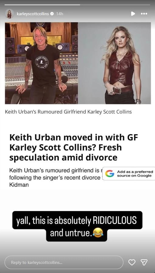 Duke ripostuar në Instagram Stories një artikull me titullin “Keith Urban është zhvendosur me Karley Scott Collins? Spekulime të reja pas divorcit”, ajo shkroi: “Ju lutem, kjo është absolutisht qesharake dhe e pavërtetë”.
