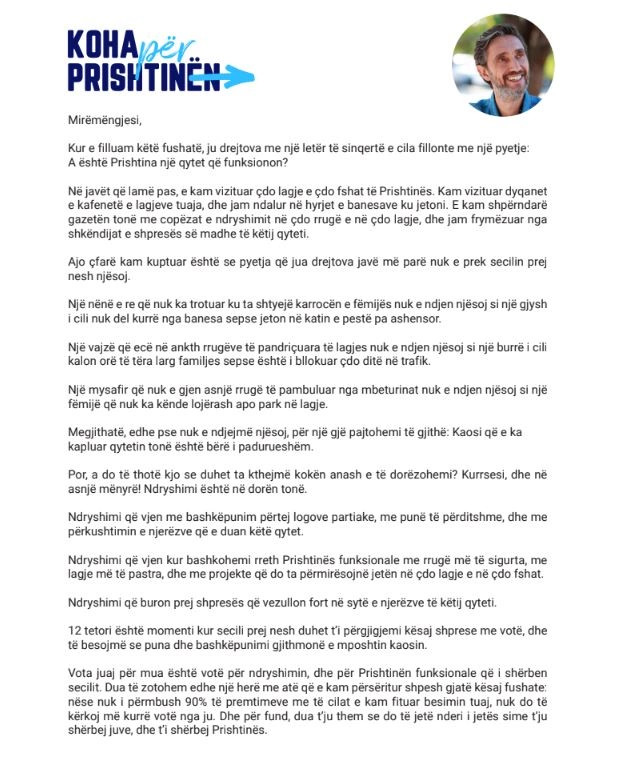 Kandidati për Prishtinën nga PDK, Uran Ismaili, ka përcjellë një letër për qytetarët një ditë para zgjedhjeve.