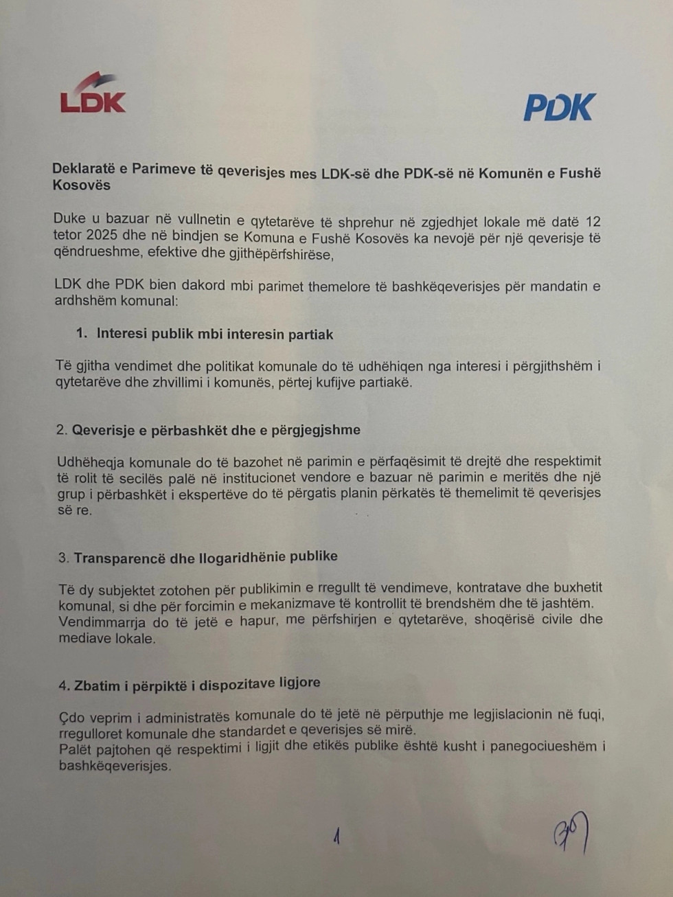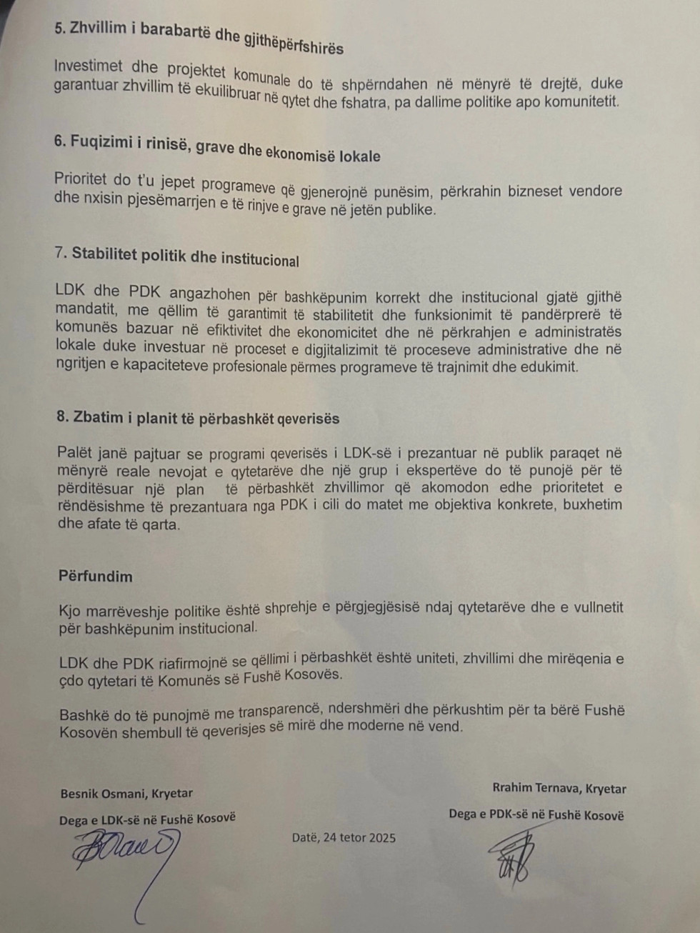 E dega e LDK-së në Fushë-Kosovë e ka publikuar marrëveshjen e nënshkruar më 24 tetor.